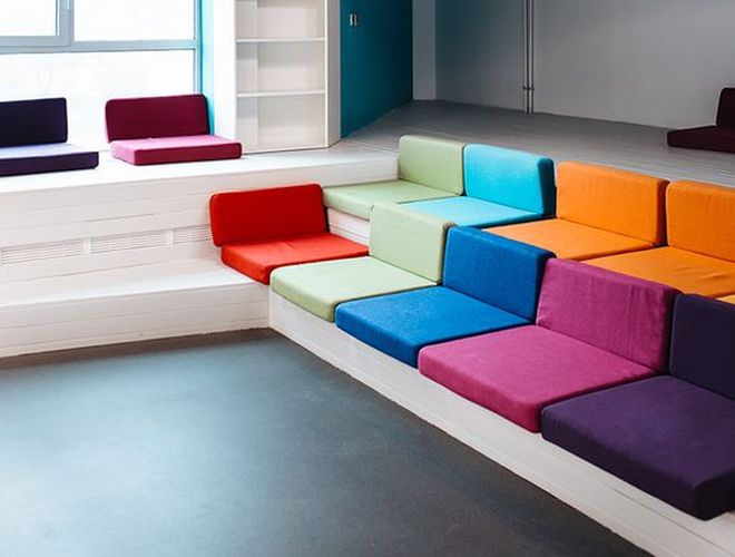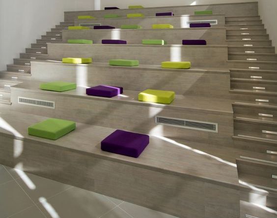 Все больше общественных пространств, в мире оформляется по принципу колизея: ступени, на которых можно присесть, и при этом остается место для прохода. Так выглядят аудитории, классы, различные залы и даже места ожидания, где необходимо сэкономить место и есть возможность подъема на другой этаж.